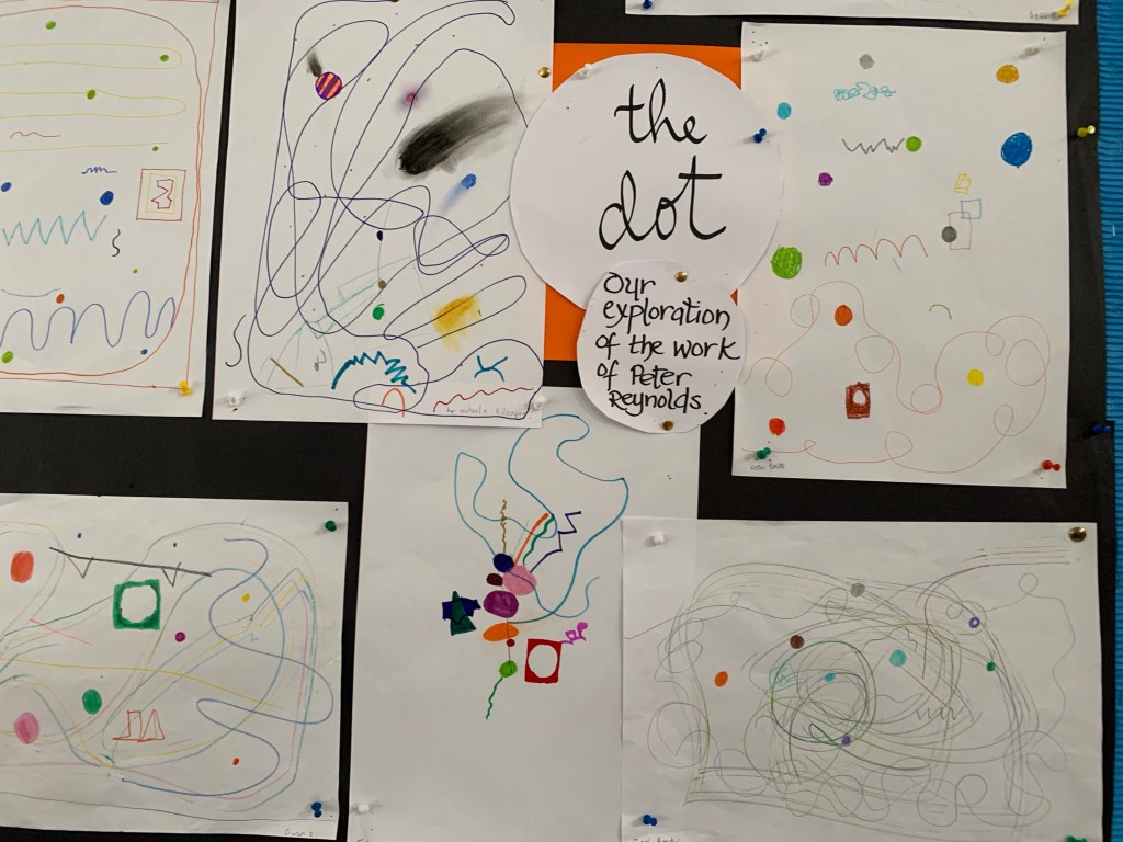 We’ve been studying drawing…starting with The Dot, discussing foreshortening (Hulk smash!) and stages of drawing development. Impressive!