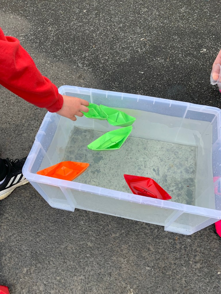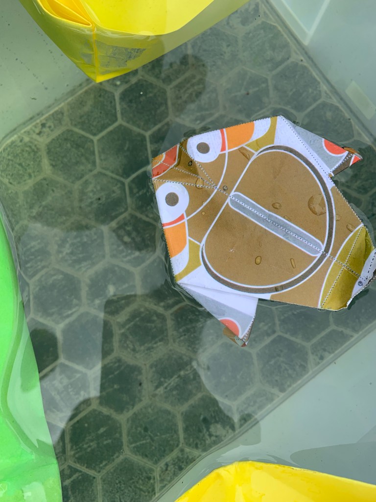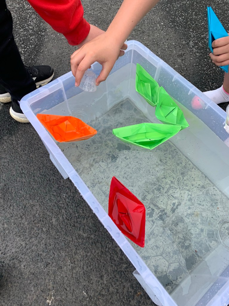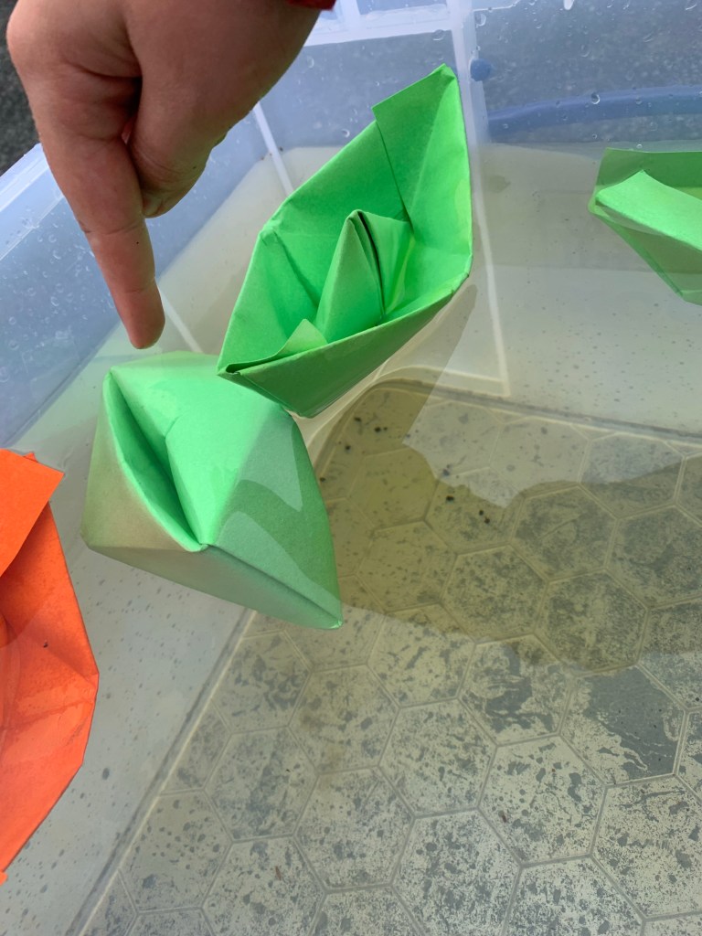 Using measuring cups, the children poured precise measures into their vessels! We kept a count of all the millilitres we poured.The boats and a gentle hand stayed the same, but the amount of water we poured in changed- the basis of fair testing.Most boats were sea-worthy! Their design meant they displaced their weight quite well on the seas!A measuring cup! Pouring on 30mls! Some adjustments at sea! We have one or two additional designs. These were lovingly crafted with reinforcement materials- sellotape! A capsized vessel.An origami bird, from our first foray into our Japan projects!