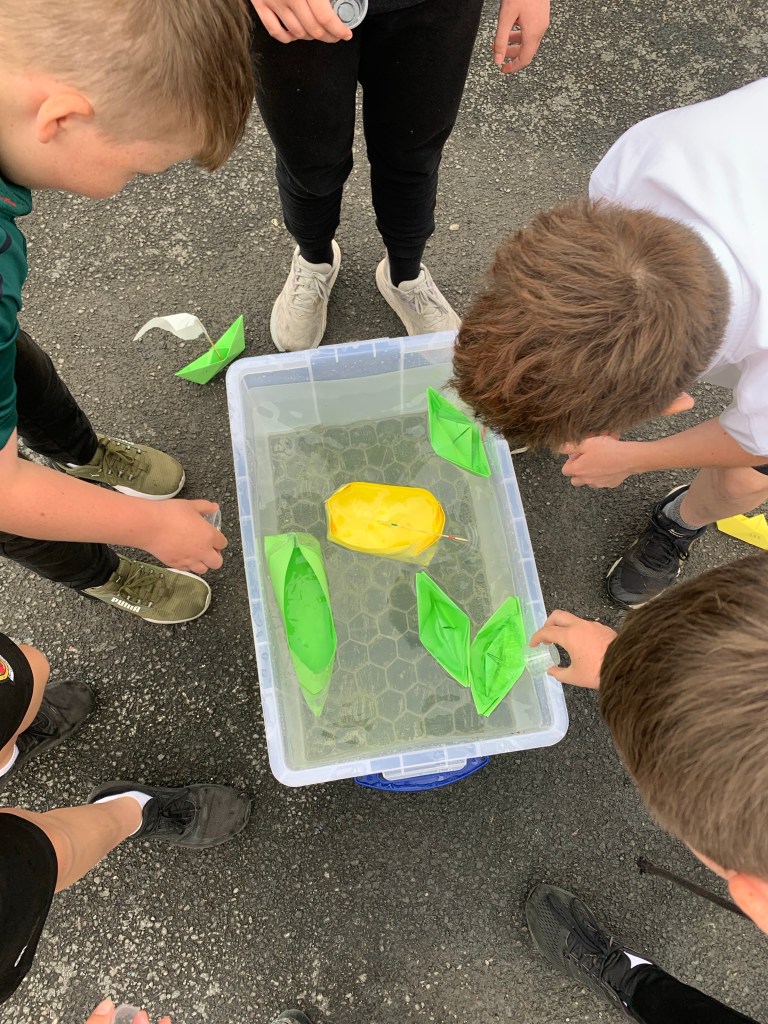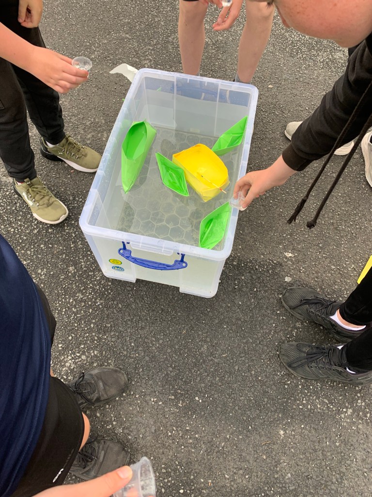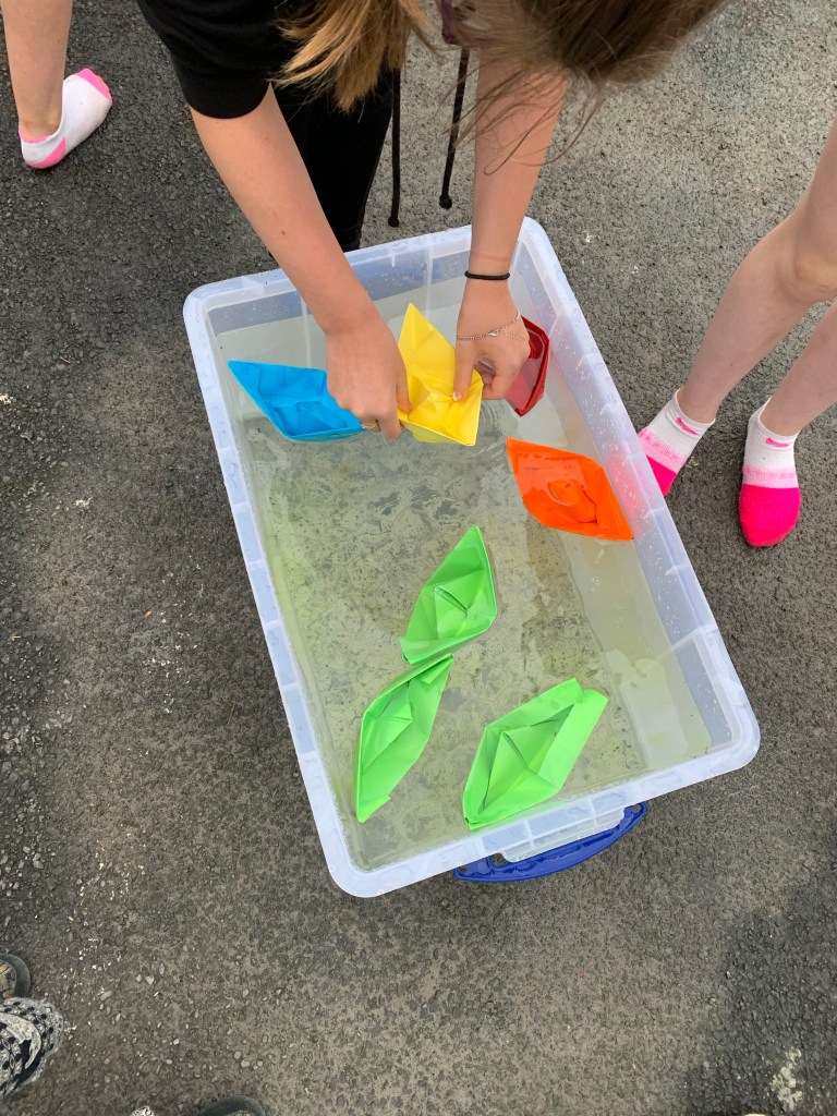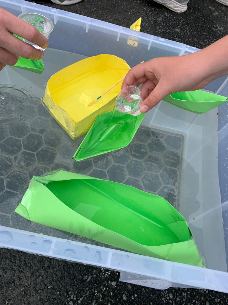 Using measuring cups, the children poured precise measures into their vessels! We kept a count of all the millilitres we poured.The boats and a gentle hand stayed the same, but the amount of water we poured in changed- the basis of fair testing.Most boats were sea-worthy! Their design meant they displaced their weight quite well on the seas!A measuring cup! Pouring on 30mls! Some adjustments at sea! We have one or two additional designs. These were lovingly crafted with reinforcement materials- sellotape! A capsized vessel.An origami bird, from our first foray into our Japan projects!