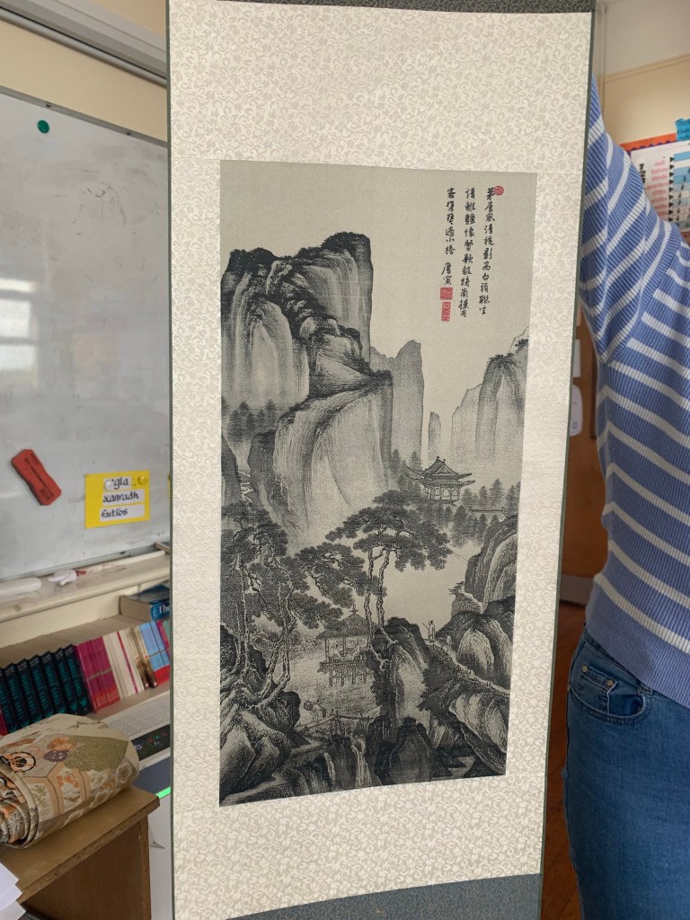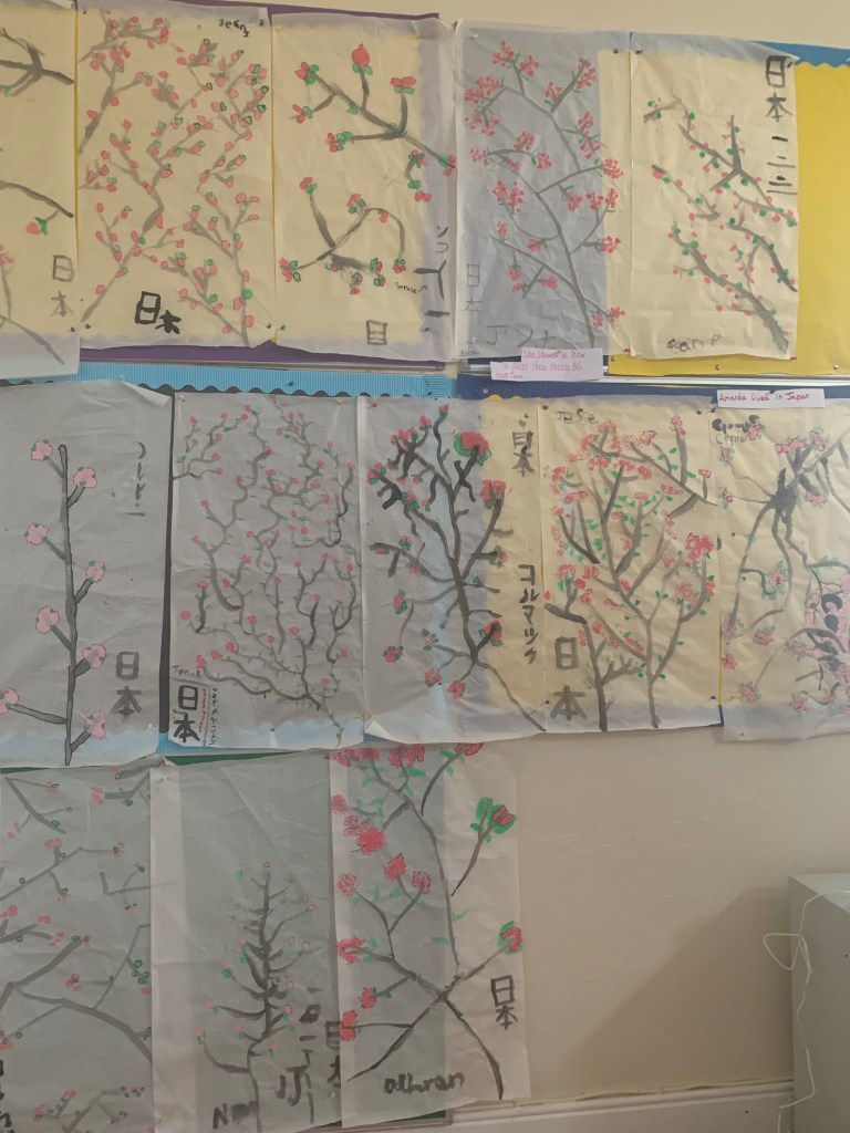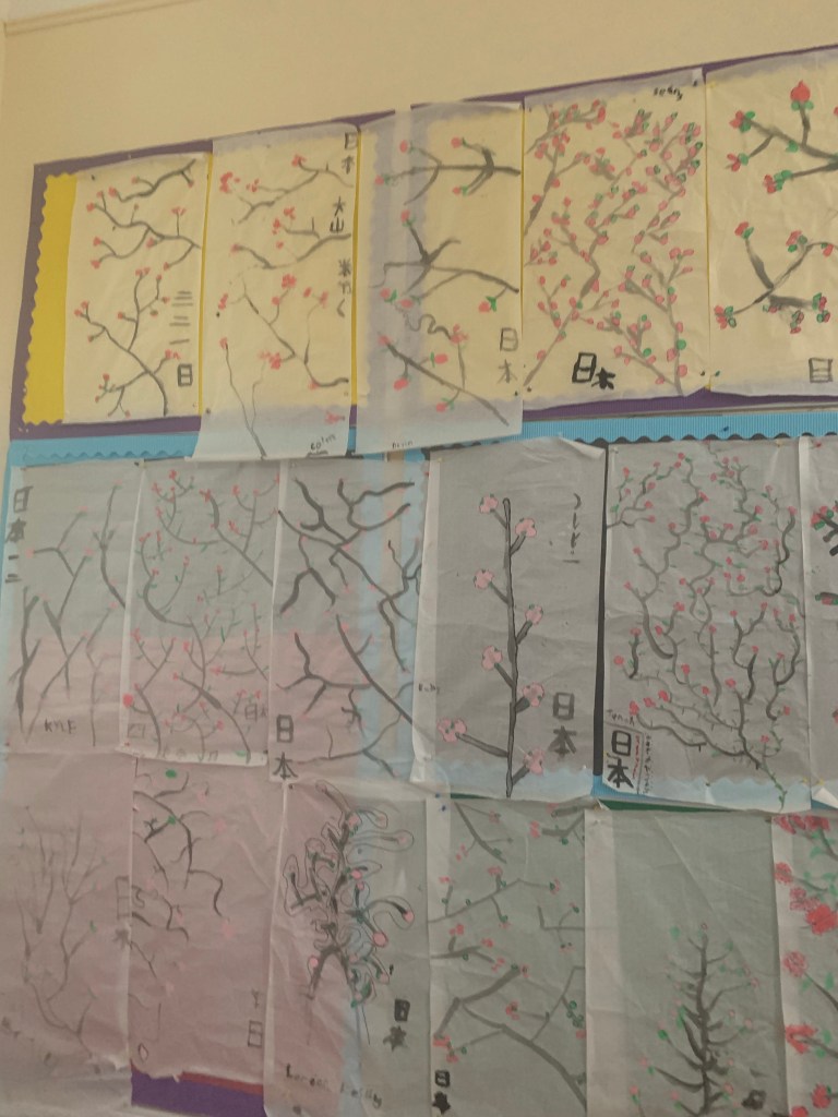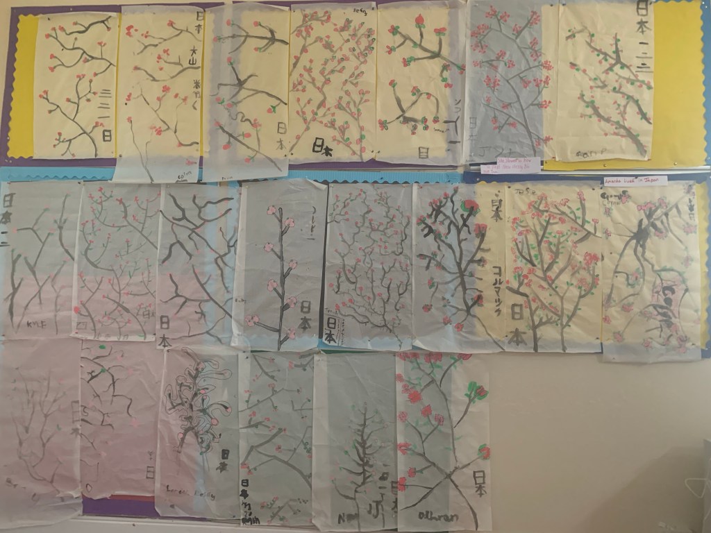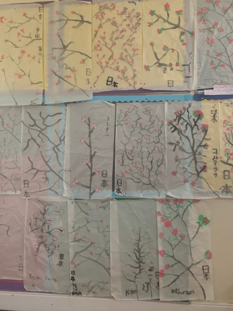 A scroll.Miso Soup!Delicate paper.Painted eggs- similar to those she brought to school after we painted eggs in art.The children explored the resources.An unwound scroll with a carefully detailed illustration.The children used Amanda’s rice paper and inks to create these amazing blossom trees.Another view.The details were carefully painted in.Beautiful rice paper blossoms.The superb work of the middle classes!