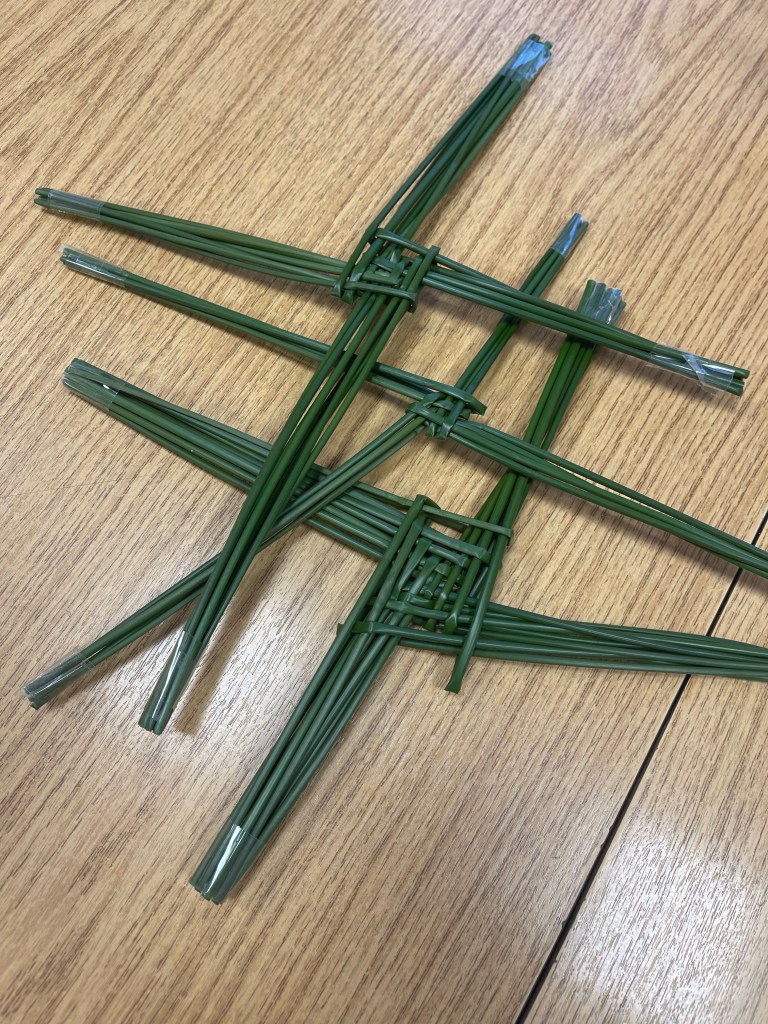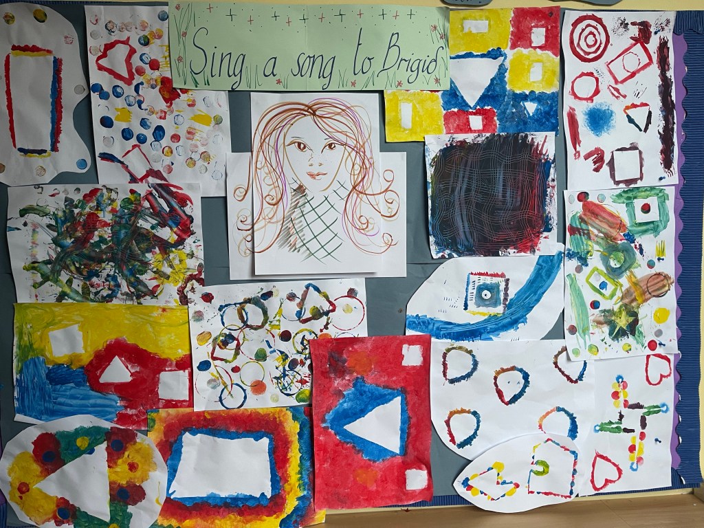 We made a wall display for St Brigid, inspired by the Celtic Goddess Imbolc, and designed her hair using over-printing of found objects, combing, masking-out and stencil prints of our own design.