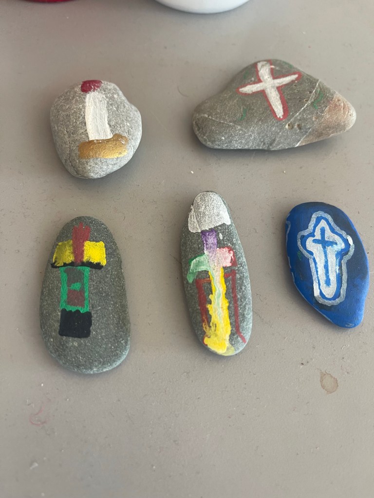 The 6th class have started their confirmation preparation by painting special crosses in these beach stones teacher gathered for them.