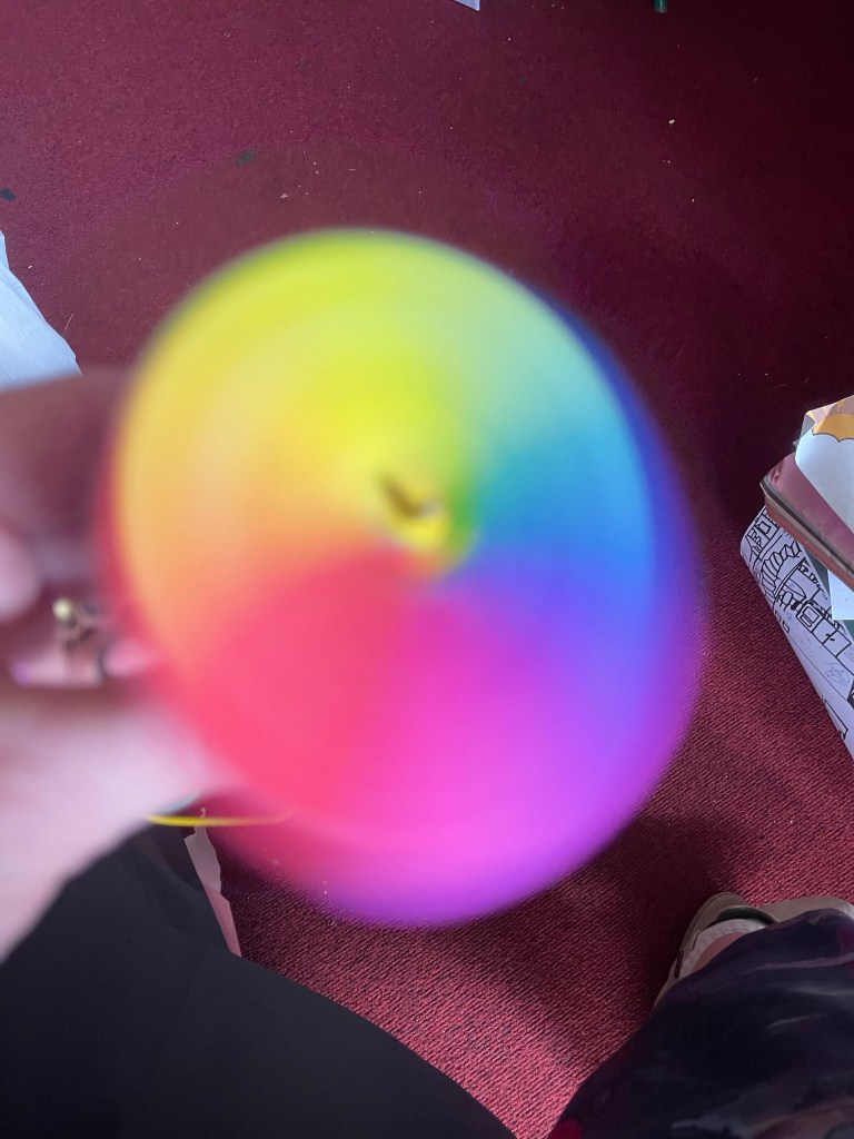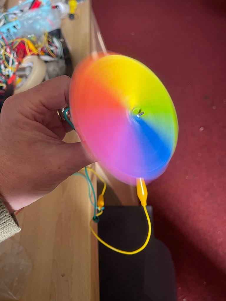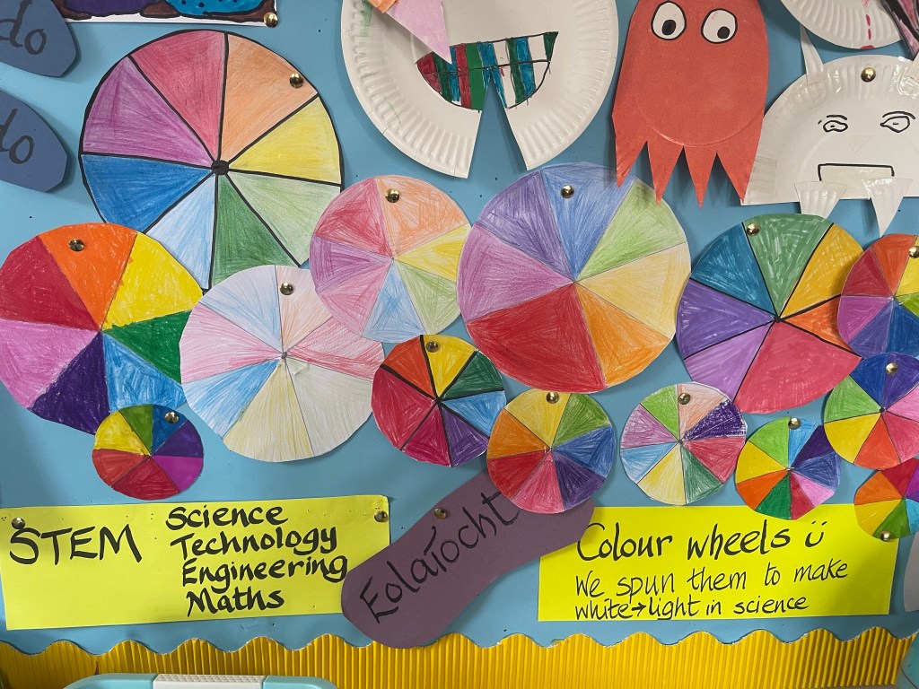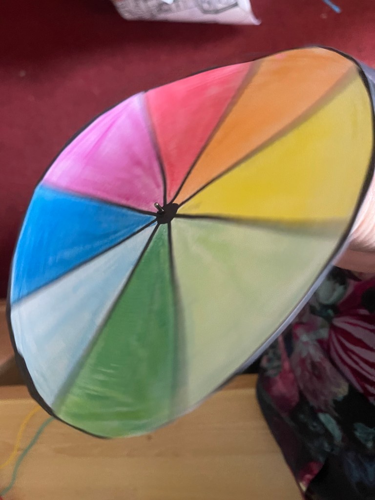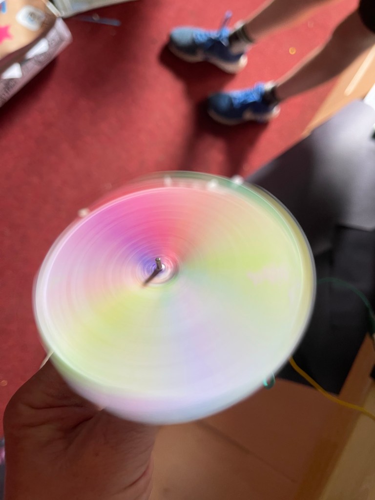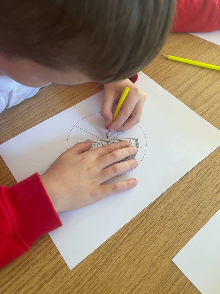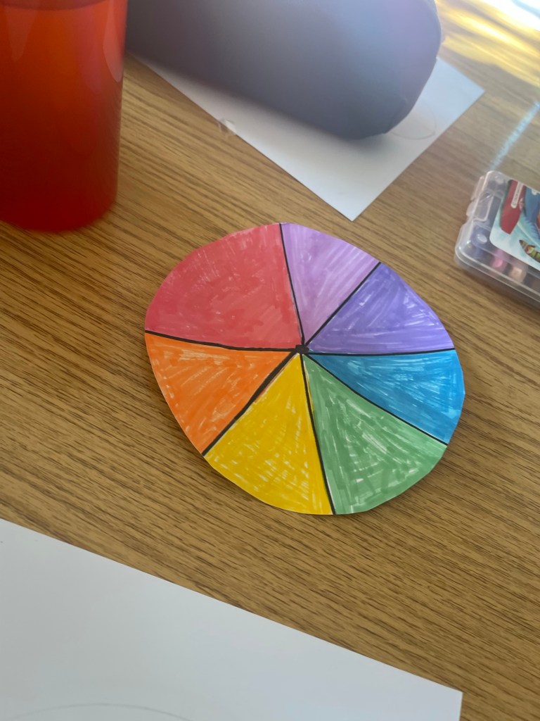 We made colour wheels using compasses and measured using our protractors, having divided our 360 degree circles by 7- the number of colours in the rainbow.