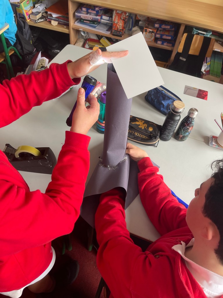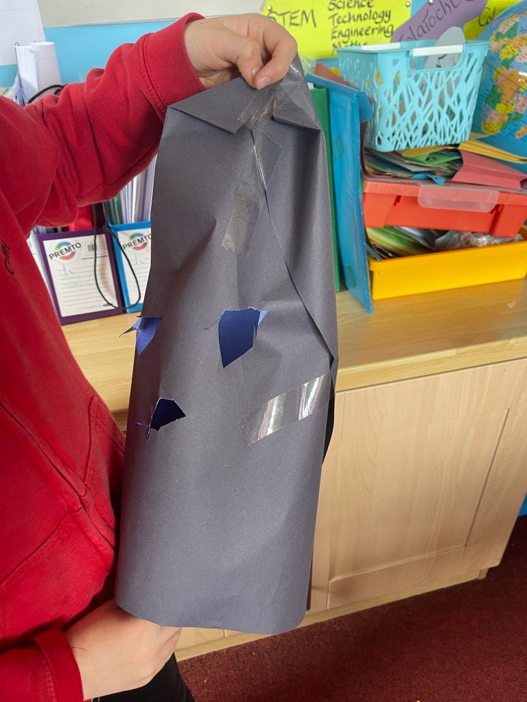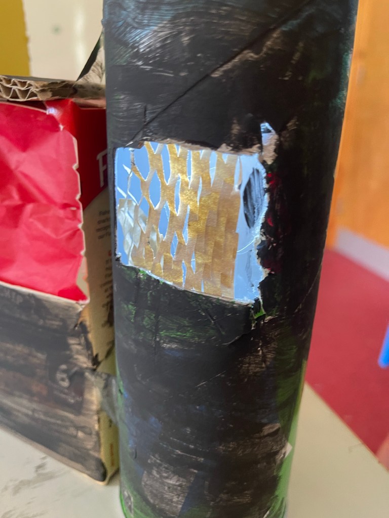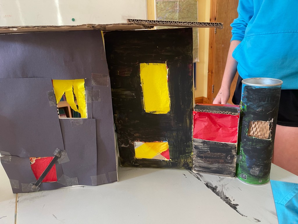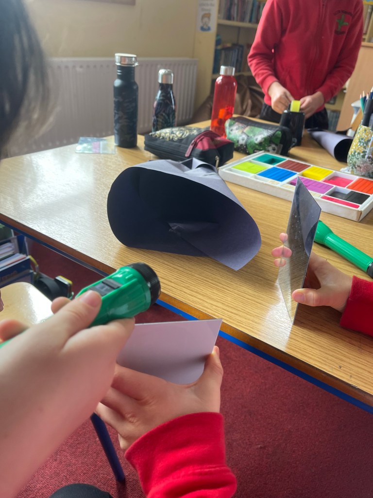 We also experimented with bouncing light, using torches and mirrors to reflect light to get it through our sugar paper tunnels and spaces!