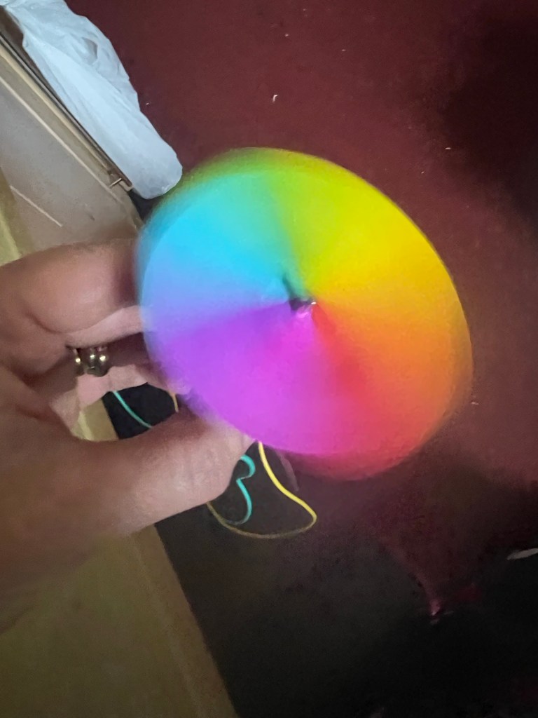 The light reflects the colours so quickly, the eyes and brain can’t see them, so we see white!