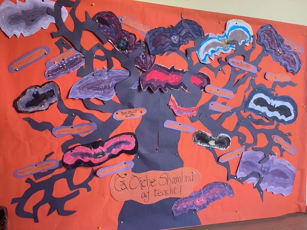 We made Hallowe’en íaltóga, using tones of our mixed colours, and radiated these out behind our stylised bats.