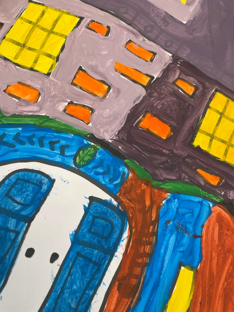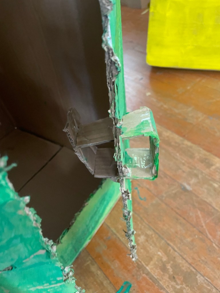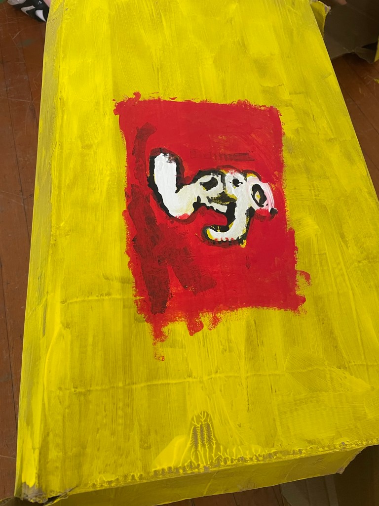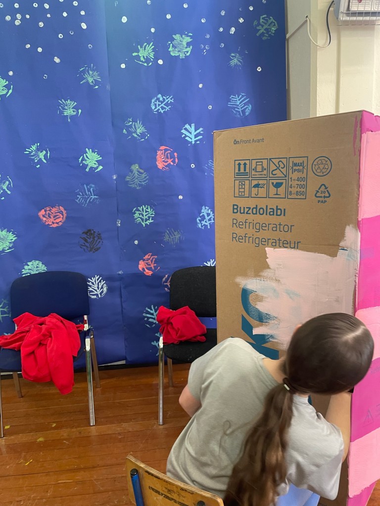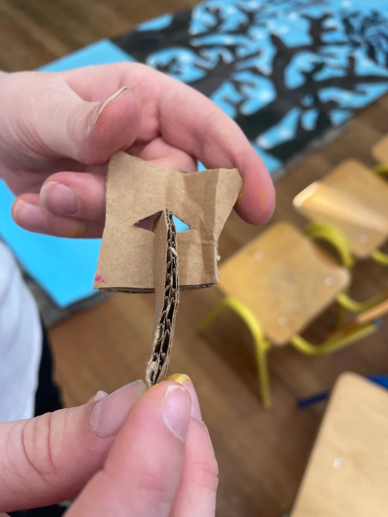 We’ve started the backdrops of toy shelves, the over-prints using draught-excluder blocks, and scratch-art baubles.