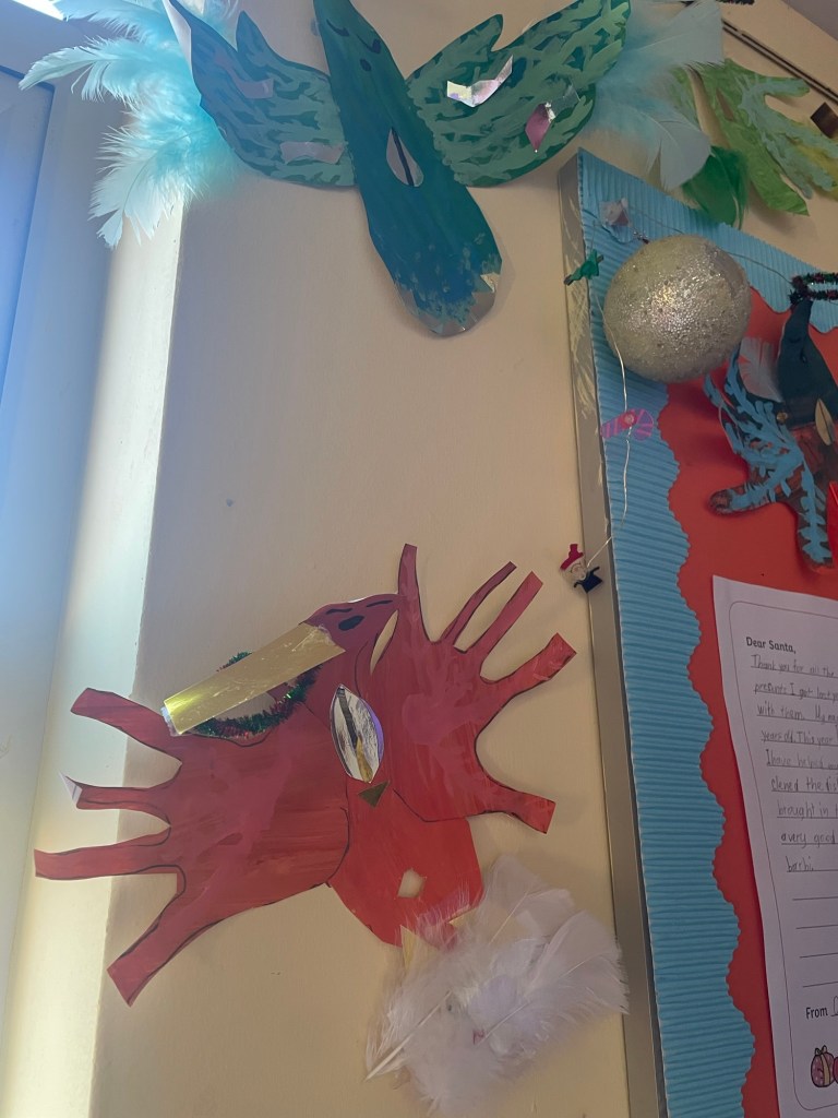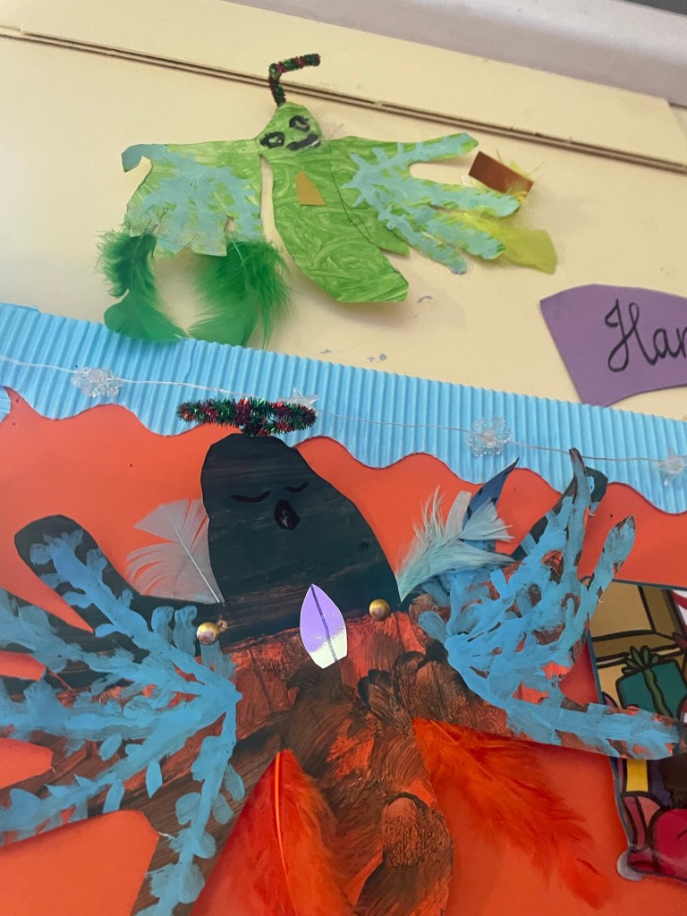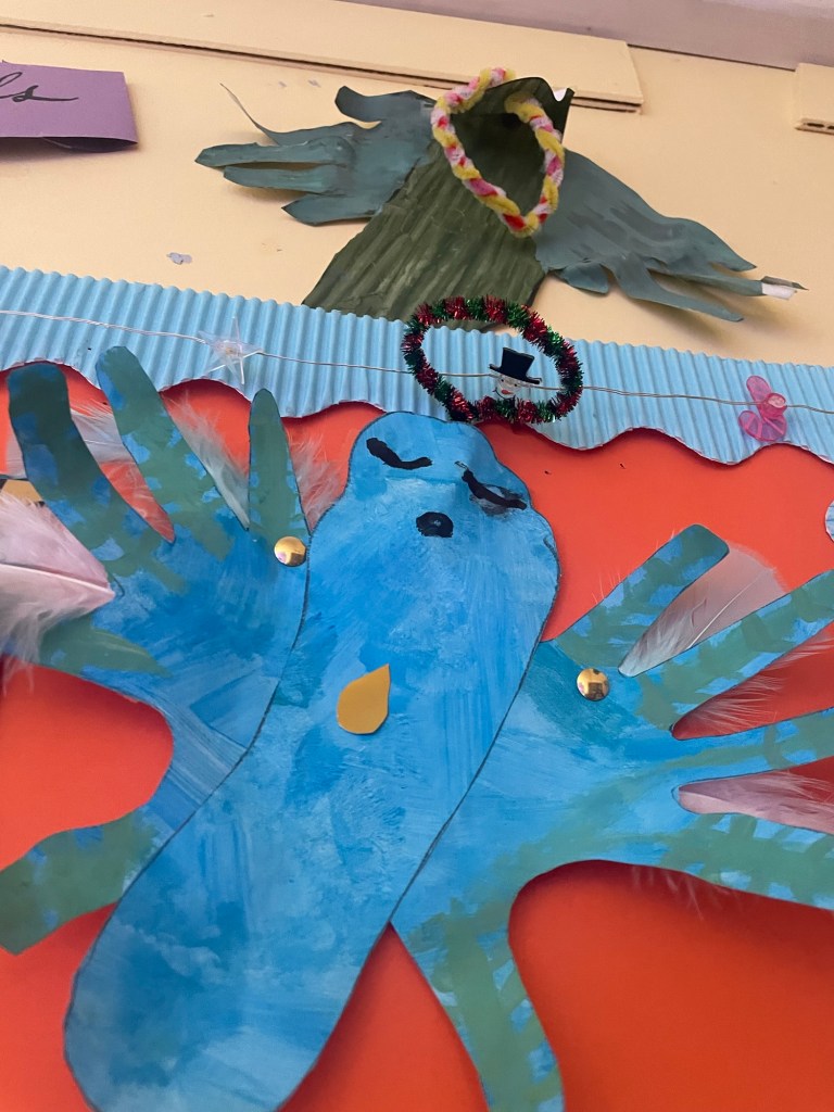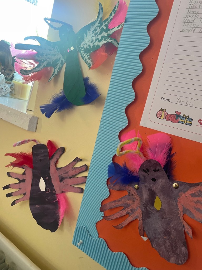 The notice board is decorated with hand and footprint angels and some exciting feather and pipe cleaner embellishments!
