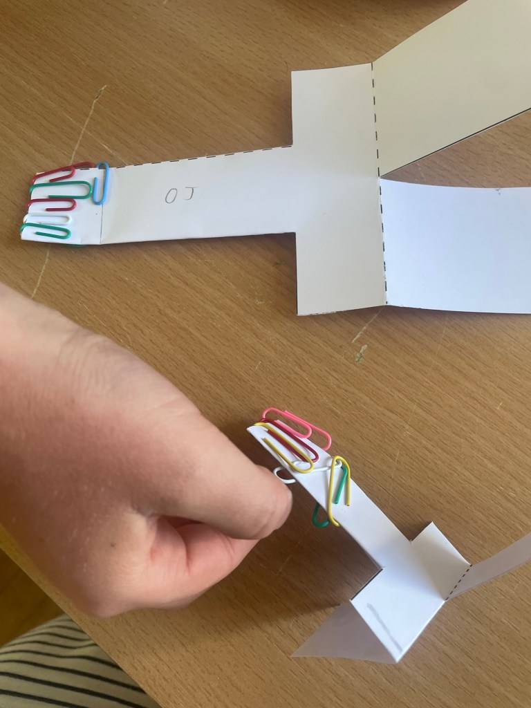 We made one large and one smaller helicopter and then we anchored and weighted them with a paper clip.