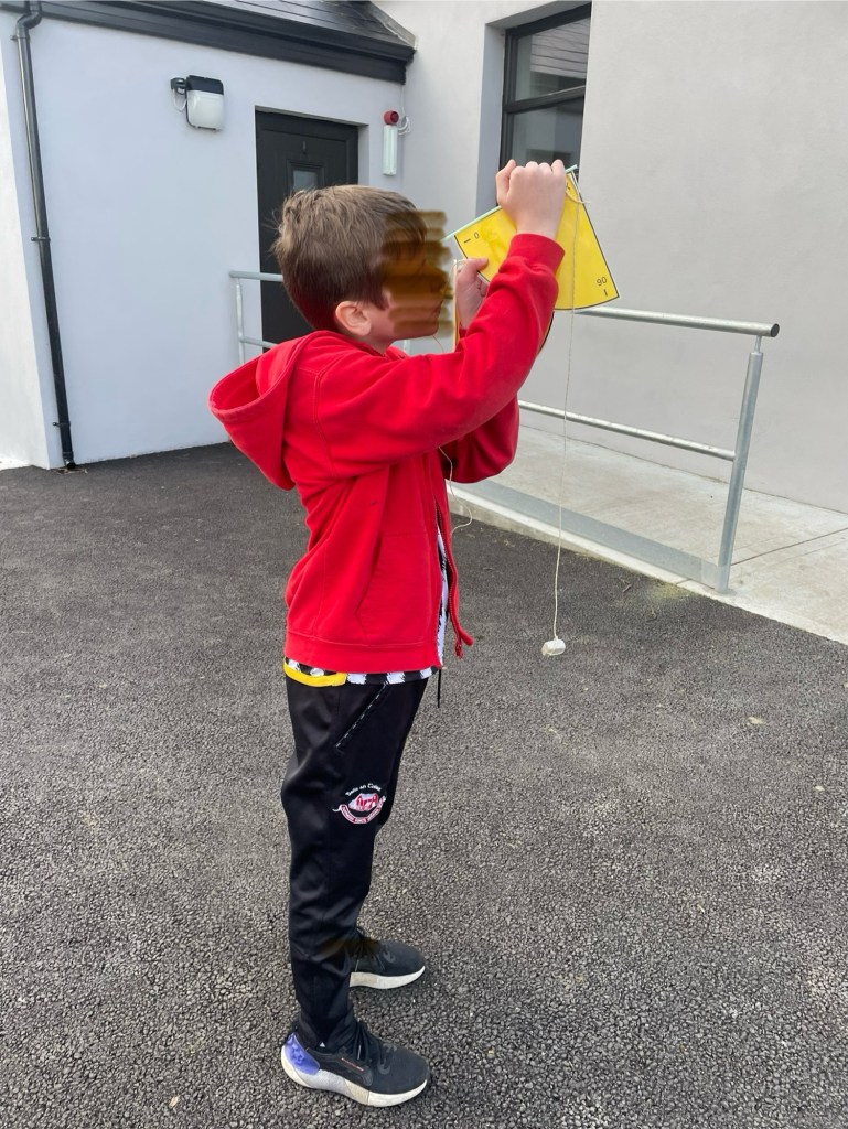 Using string, rubbers as weights and straws taped to protractors, we hit for the Community Centre trees to test out our clinometer designs with the help of Ms P, our TY right-hand woman!